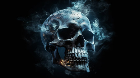Human skull with blue smoke on black background.generative ai
