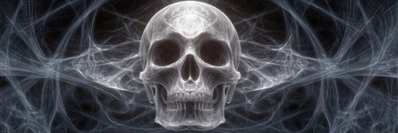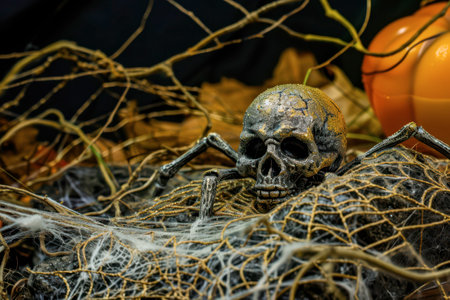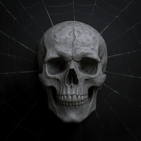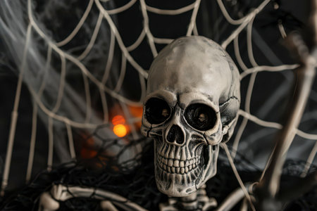 A detailed skull rests among delicate cobwebs, creating an eerie atmosphere perfect for Halloween celebrations. The dark background enhances the chilling effect, allowing the intricate textures to stand out.