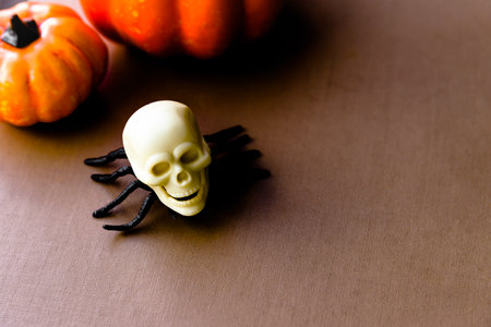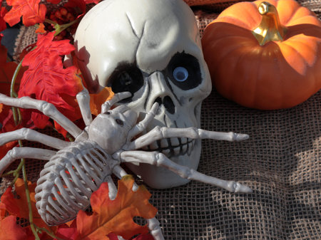 A still life presentation of a skull, spider and Autumn leaves with copy space. Halloween Theme.