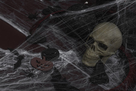 Creepy Halloween composition. Creative background, traditional symbols. Decorative skull, candles, spider web, pumpkins and bats. Dark atmosphere mood