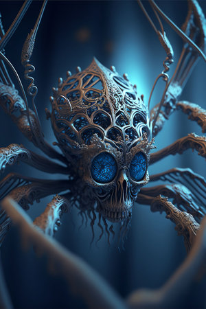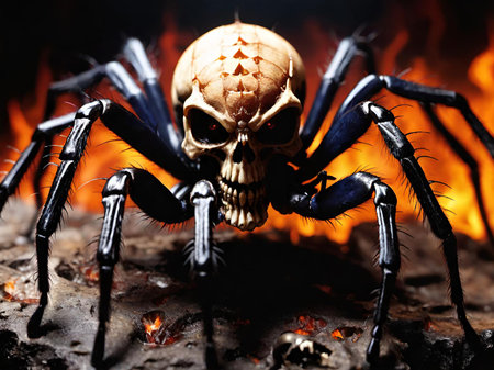 An AI-generated illustration of a creepy spider creature with a skull