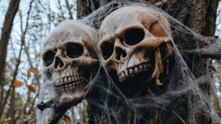Halloween decorations with cobwebs and skulls hanging from tree branches in a forest