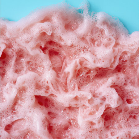 Close-up of translucent bubbles and soft foam in pink hues, creating a dreamy and vibrant abstract texture on a bright background.