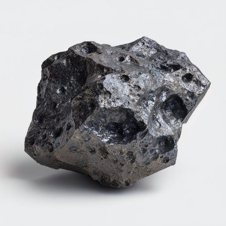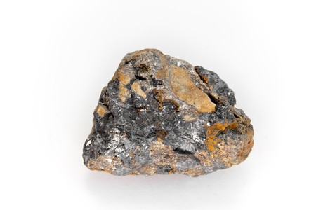 A single, unrefined specimen of a metallic mineral, showcasing its natural crystalline structure and brilliant, reflective luster. Isolated on a clean white background, this image highlights the raw beauty and industrial potential of geological resources, perfect for scientific, educational, or metallurgical themes.