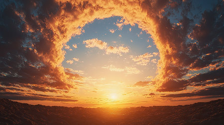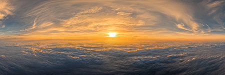 Panoramic Sunset Above Majestic Cloudscape, Serene Golden Hour Sky, Aerial Perspective