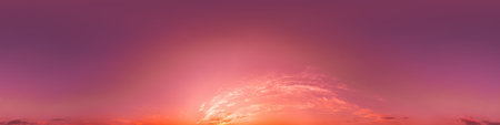 Dramatic Sunset sky 360 panorama. Vibrant sky panorama with bright glowing red pink Cumulus clouds. HDR 360 seamless spherical panorama. Sky dome for aerial drone panoramas. Climate and weather change