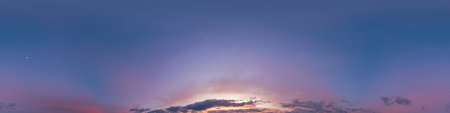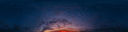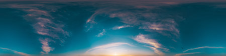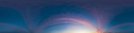 360 panorama of dark blue sunset sky with bright pink Cirrus clouds. HDR 360 seamless spherical panorama. Full zenith or sky dome sky replacement for aerial drone panoramas. Climate and weather change