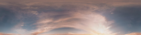 360 panorama of glowing sunset sky with bright Cirrus clouds. Seamless hdr spherical 360 panorama. Sky dome in 3D visualization, sky replacement for aerial drone panoramas. Weather and climate change