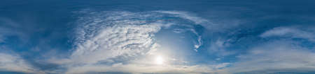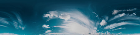 Blue sky panorama with Cirrus clouds. Seamless hdr 360 degree pano in spherical equirectangular format. Complete zenith for 3D visualization, game and sky replacement for aerial drone 360 panoramas.