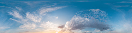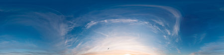 Bright sunset sky panorama with Cirrus clouds. Seamless hdr spherical equirectangular 360 panorama. Sky dome or zenith for 3D visualization, game and sky replacement for aerial drone 360 panoramas.