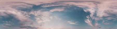 Seamless hdri panorama 360 degrees angle view blue pink evening sky with beautiful clouds before sunset with zenith for use in 3d graphics or game development as sky dome or edit drone shot