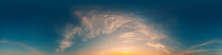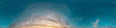 Sunset sky panorama with Cirrus clouds in Seamless spherical equirectangular format. Complete zenith for use in 3D graphics, game and for composites in aerial drone 360 degree panoramas as a sky dome