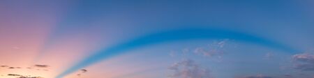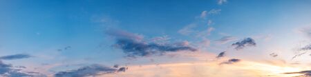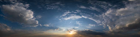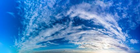 Warm sunny blue sky with fluffy clouds. Sunset sunlight illuminates the sky in sunset time. Beautiful ultra-wide panoramic background of atmosphere