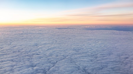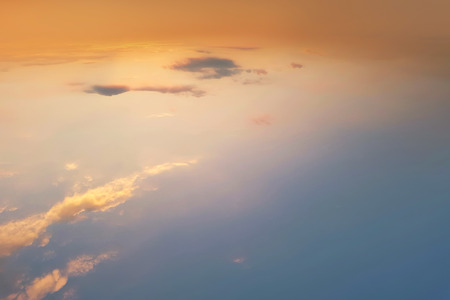 Beautiful aerial view above clouds at sunset. View from airplane window