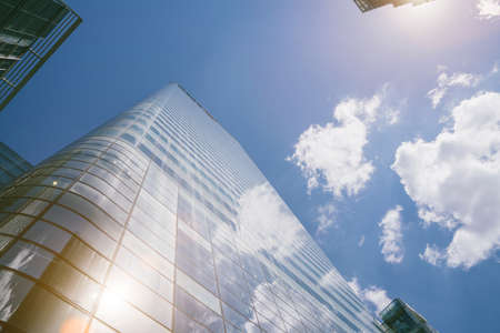 Low angle on glass facades of modern skyscraper in sunny day. Concept of business background with architecture details of financial district building