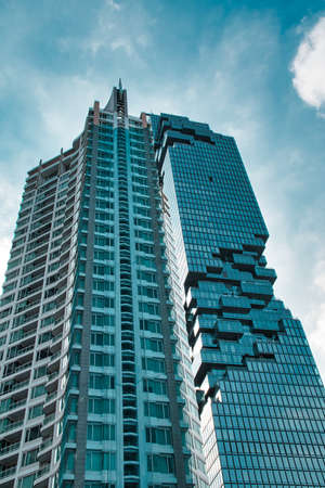 underside panoramic and perspective view to steel blue glass high rise building skyscrapers, business concept of successful industrial architecture