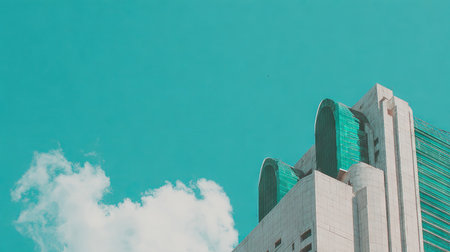 A striking perspective of a modern architectural building reaching towards a vibrant blue sky, capturing the essence of contemporary design and urban landscape.