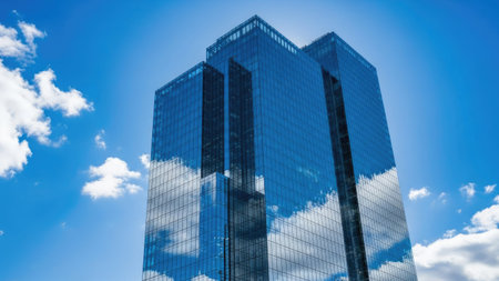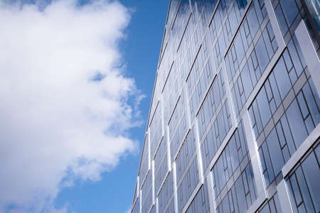 Modern curtain wall made of glass and steel. Blue sky and clouds reflected in windows of modern office building.