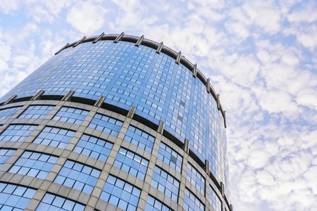 Top of round skyscraper of glass and reinforced concrete against the blue sky with clouds. Bottom view.