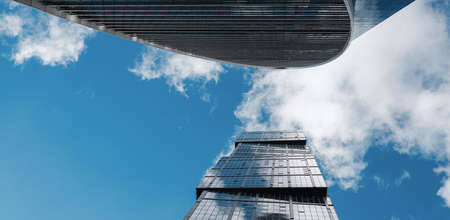 Modern corporate buildings against blue cloud sky in winter cold day. High-rise buildings in Moscow city. low angle view