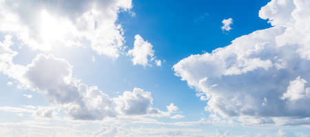 White clouds against a bright blue sky. Change from clear sunny weather to cloudy. Wallpaper for news about weather forecast. Clearing after rain. Religious appeal to the Almighty. Feeling of infinity