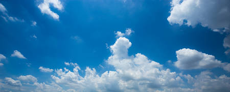 horizontal shot of bright blue sky with puffy white clouds.