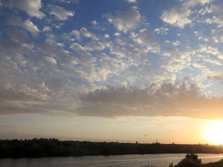 Beautiful sunset on the river with cloudy skies reflected in the water in summer.