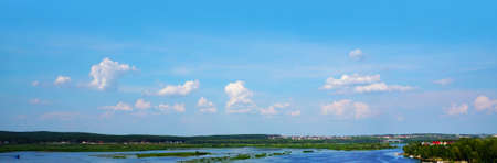 Beautiful summer landscape with lake and clouds reflected in water, panorama