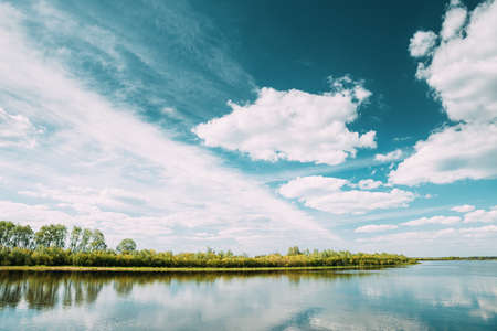 Beautiful summer landscape with river and clouds. Sunset over the river.
