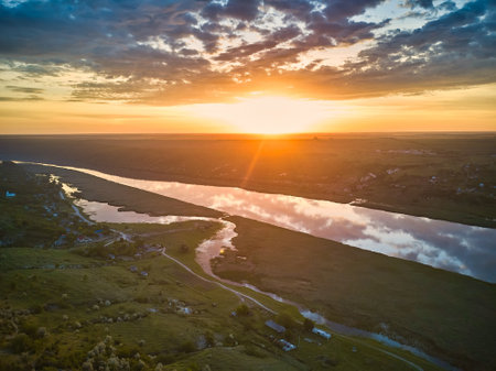 Captivating view of a beautiful river winding through lush green fields under a vibrant sunset sky. The peaceful landscape invites adventure and exploration.