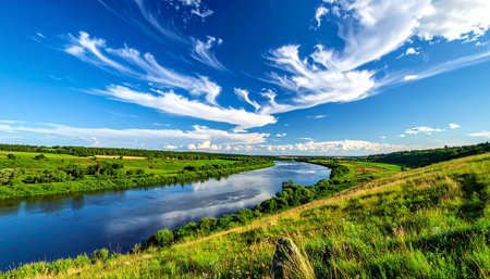 Through showing expansive river meandering through green fields under a vast blue sky with wispy clouds.