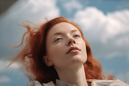 Portrait of a young woman with flowing hair against a cloudy sky background, conveying a sense of serenity and introspection