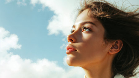 A woman looking up, her hair blowing in the wind against a blue sky, portraying freedom, thoughtfulness, or aspiration