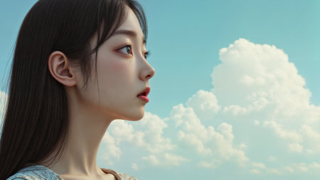 Serene profile of young woman against a sunny sky with fluffy clouds..