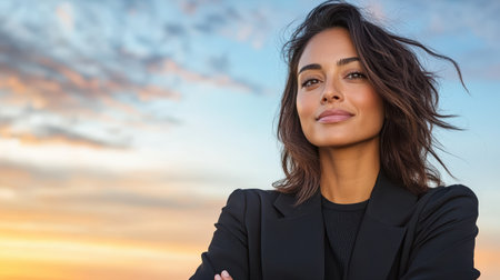 A Confident Asian woman with sunset background, exuding positivity and strength