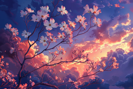 A breathtaking view of blooming pink cherry blossoms against a stunning sunset backdrop. This vibrant scene evokes tranquility and natural beauty, perfect for inspiration.