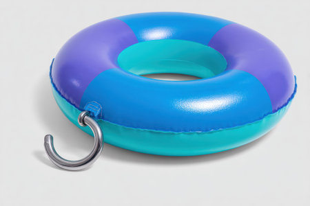 This image features a vibrant inflatable swim ring in shades of blue, turquoise, and purple, set against a clean white background. The ring has a circular shape with a metal hook attached. The composition uses bright lighting to highlight the object's colors and texture, suitable for various promotional and advertising projects.
