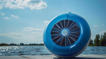 Portable Blue Inflatable Fan Next to a Serene Lake on a Sunny Day