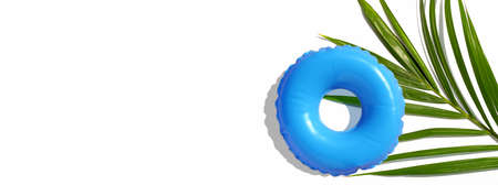 Blue inflatable swimming pool ring with tropical palm leaves. Summer background concept