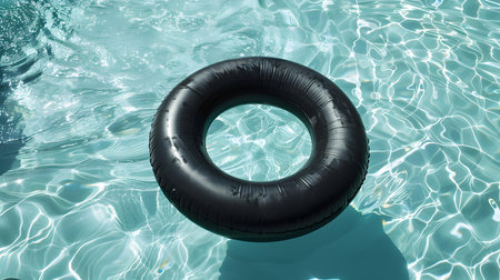Top view of a black inflatable ring floating on pool water. Colorful Summer Wallpapers