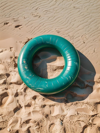 Top view of a green inflatable swimming ring on the beach