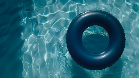 Top view of a navy blue inflatable ring floating on pool water. Colorful Summer Background