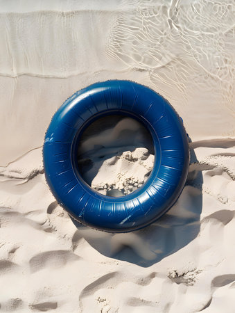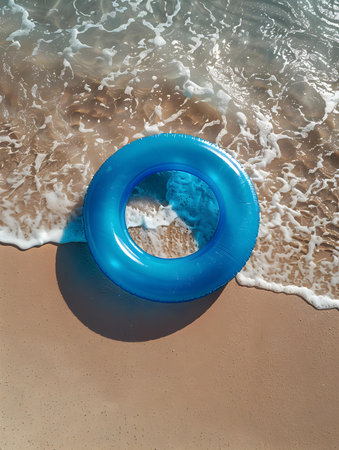 Top view of a blue inflatable swimming ring on the beach
