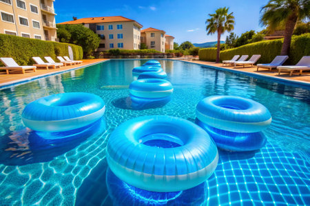 Bright blue swimming pool with inflatable floaties. Ample space for copy in the background. Summer relaxation