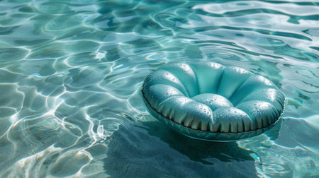 A round inflatable ring floats gently on serene water, illuminated by sparkling sunlight. The clear blue reflects a peaceful atmosphere conducive to relaxation.