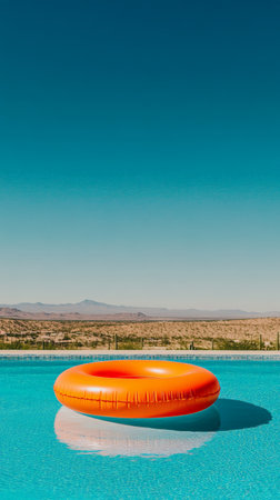 Orange inflatable ring floats serenely in a turquoise swimming pool, set against the backdrop of a vast desert landscape under a clear blue sky, creating a perfect summer holiday scene