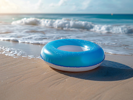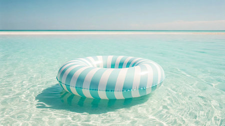 Colorful striped inflatable tube on sandy beach summer scene with calm turquoise sea soft clouds and relaxing mood