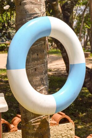 Blue and white rescue buoy hanging from a palm tree trunk in a hotel in Mombasa