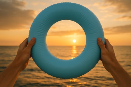 Hands grip a blue inflatable ring, framing a beautiful sunset over the ocean surface