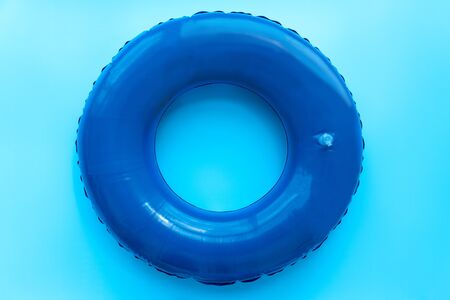 Front view of blue rubber ring for swimming pool on blue background. Top view